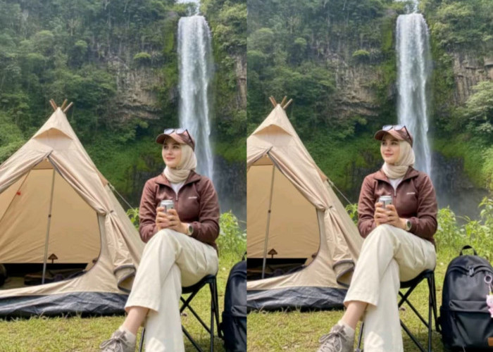 “Edit foto ini sedang berada di sebuah tempat air terjuan yang indah nan hijau,dengan resolusi warna da cahaya real,kualitas HD dan Perfect. Ia mengenakan outfit jaket olahrga wanita warna Choco,kerudung lilit warna cream,celana cargo jins cream,dan topi warna choco ada tulisan kecil,sepatu sneaker gunung warna Abu,tas ransel kecil dengan gantungan sleting lucu,serta kacamata hitam yang di simpan di topi. Ia mengenakan makeup Natural fresh,warna lipstik nude,rona pipi jangan terlalu merah ,cantik imut,putih mulus,dan elegan. Ia sedang duduk di kursi lipat gunung di pinggir tenda terbuka di depan air terjun dengan anggel kaki di silang dan memgeang sebuah minuman kaleng,seperti sedang menikmati air terjun, di tamabah dengan sinar matahari yang menyinari wajahnya.pertahankan wajah asli,jangan merubah bentuk wajah sedikitpun”.