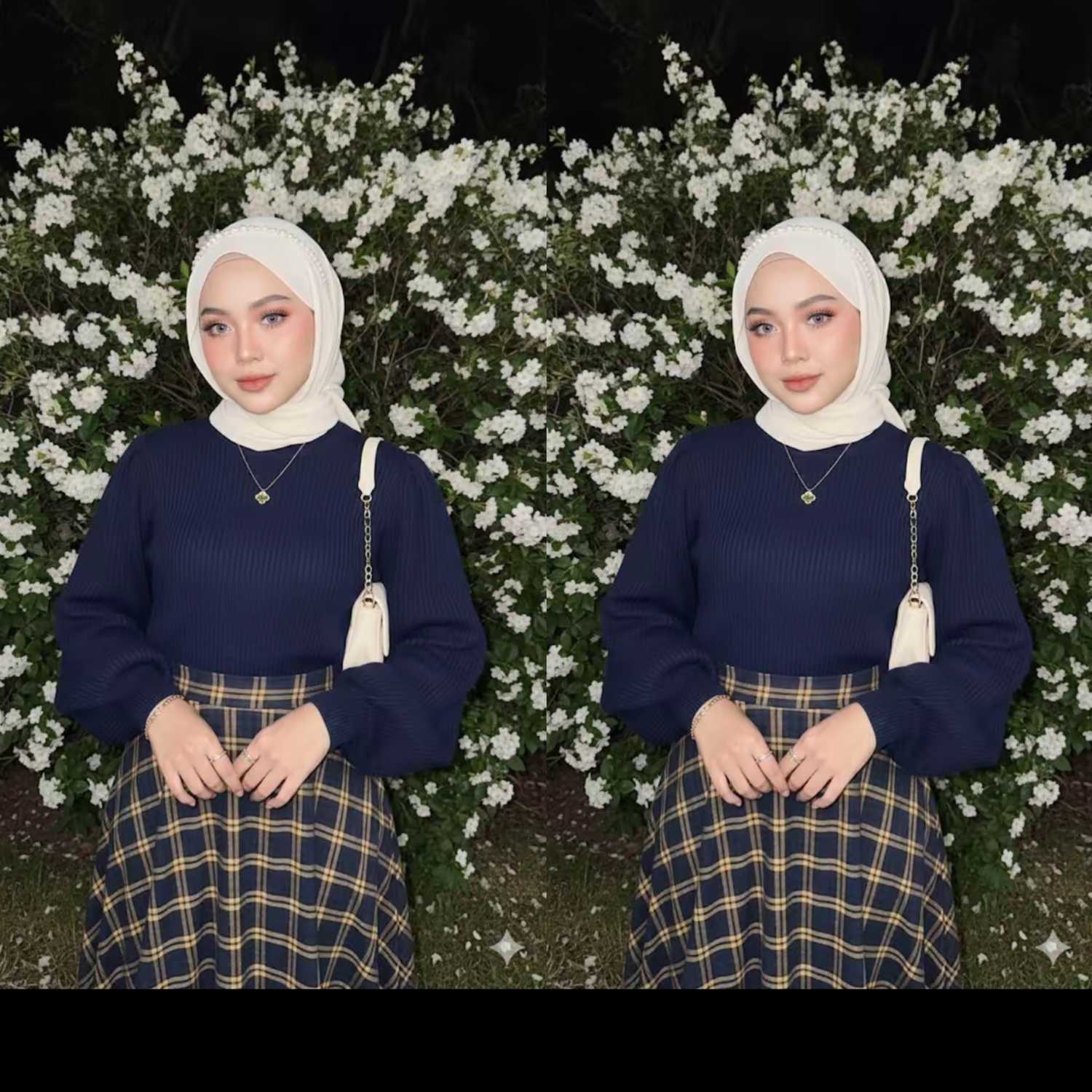 "Edit foto ini menjadi gambar hyper realistis, Potret Seorang wanita muda sangat cantik (pertahankan wajah 100% sama dengan wajah yang ada pada foto referensi). Dia berdiri di depan latar belakang yang dipenuhi bunga-bunga putih yang bermekaran di malam hari. Dia memakai hijab dililit rapi di lehernya pashmina panjang berwarna ivory, buatlah hijab dibagian mukanya bergelombang. Wajahnya halus dengan kulit cerah, riasan ringan, bulu mata panjang lentik badai, memakai softlens grey kebiruan lingkaran besar dan ekspresi wajah yang tenang namun imut. Outfit: sweater rajut biru tua lengan puff, rok midi tartan biru-coklat-hijau, tas kecil krem rantai gold di pundak. Aksesoris: kalung emas liontin clover kecil, cincin, gelang, ikat kepala mutiara di atas hijabnya. Cahaya dari lampu kilat kamera, efek retro bergaya kamera digital lama, warna lembut, berbutir, sedikit overexposed. Potret setengah badan dari lutut ke atas. Pose anggun, sangat imut. Rasio: 9:16."