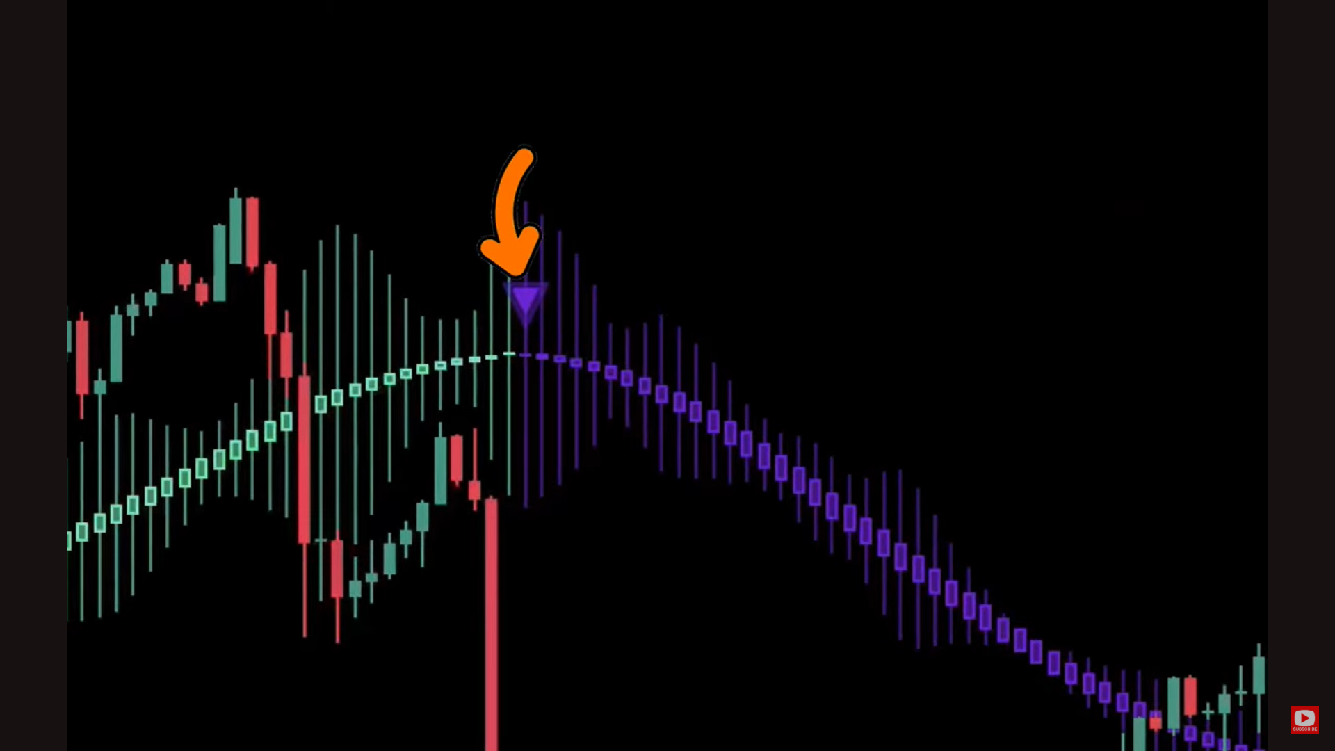 Sedangkan kriteria untuk Sell Setup adalah ketika harga berada dibawah SMA 20 Daily dan muncul tanda panah ungu dan candle ungu dengan body yang kuat. Entry bisa dilakukan pada candle berikutnya dan stop loss saat di atas panah ungu atau swing high. Dengan target risk dan reward 1: 2 atau 1:1 jika trend sudah panjang.