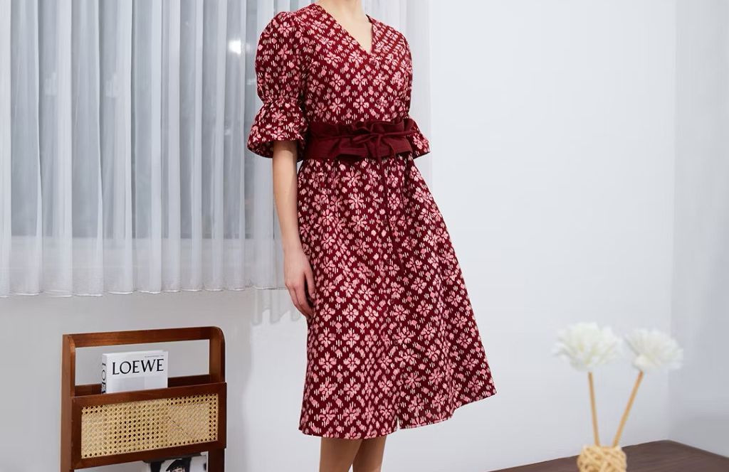 Nara dari Nayara merupakan dress batik cap dengan nuansa maroon yang kuat dan aksen obi belt modern di bagian pinggang.