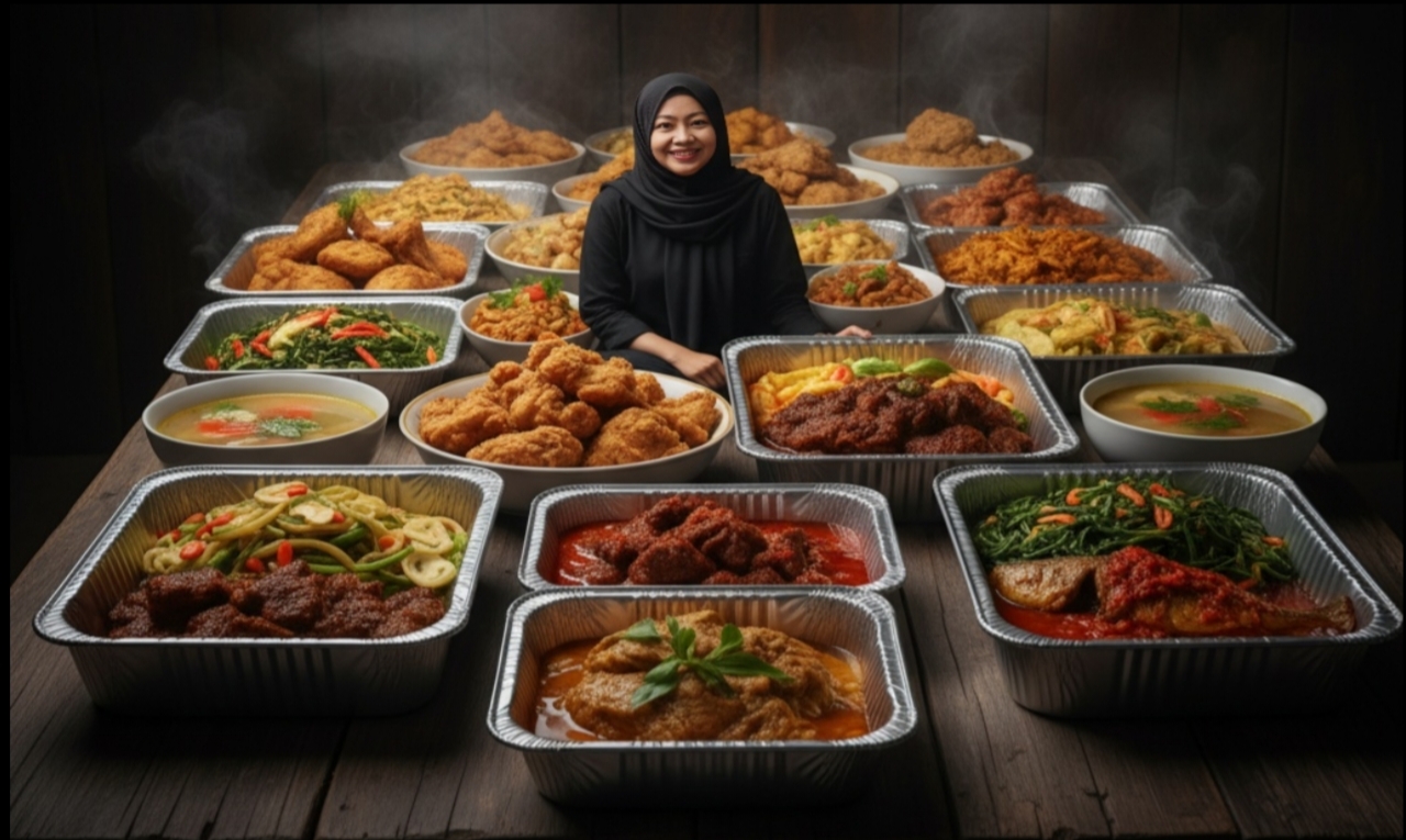 - A photorealistic surreal image of a woman wearing a black hijab and a long-sleeved black shirt, sitting cheerfully among aluminum trays filled with catering food (her body looks small). Starting from fried chicken, green vegetables, rendang, fish sauce, soup and other foods.