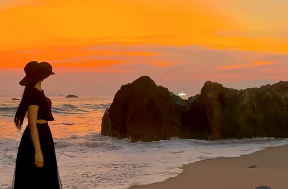 Mengabadikan momen dengan cahaya matahari senja dramatis berpadu warna-warni langit dan laut, disertai dengan mengambil berbagai sudut dan pose dengan memanfaatkan elemen alam seperti batu dan ombak.